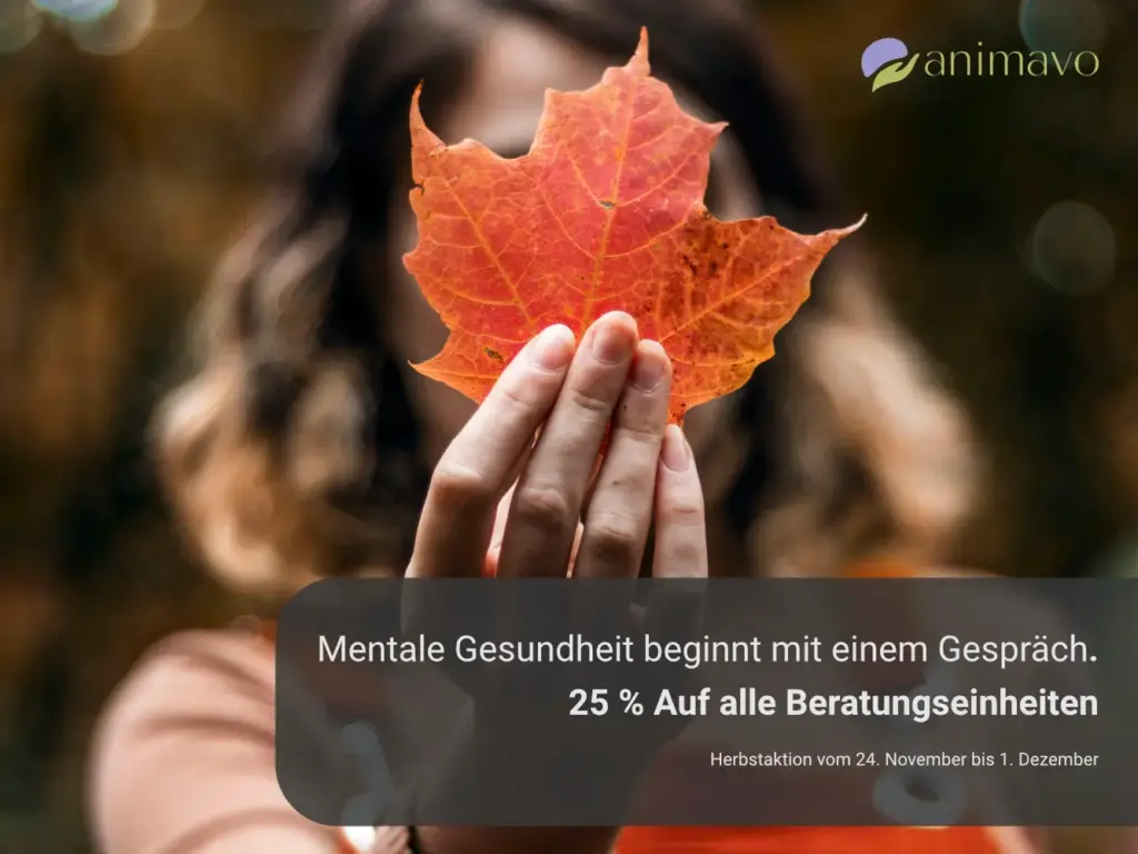 Gerade jetzt im Herbst lohnt es sich, in das eigene Wohlbefinden zu investieren. Als Motivation bietet animavo in der Zeit vom 24. November bis 1. Dezember eine spezielle Herbstaktion an: 25 % Rabatt auf alle Beratungseinheiten. Dabei ist entscheidend, wann du dir deine Einheit buchst, nicht wann sie stattfindet. Ideal, um präventiv etwas für die eigene psychische Gesundheit zu tun. Nutze jetzt diese Gelegenheit, um das Tief der kalten Jahreszeiten aktiv anzugehen und gestärkt ins neue Jahr zu starten.